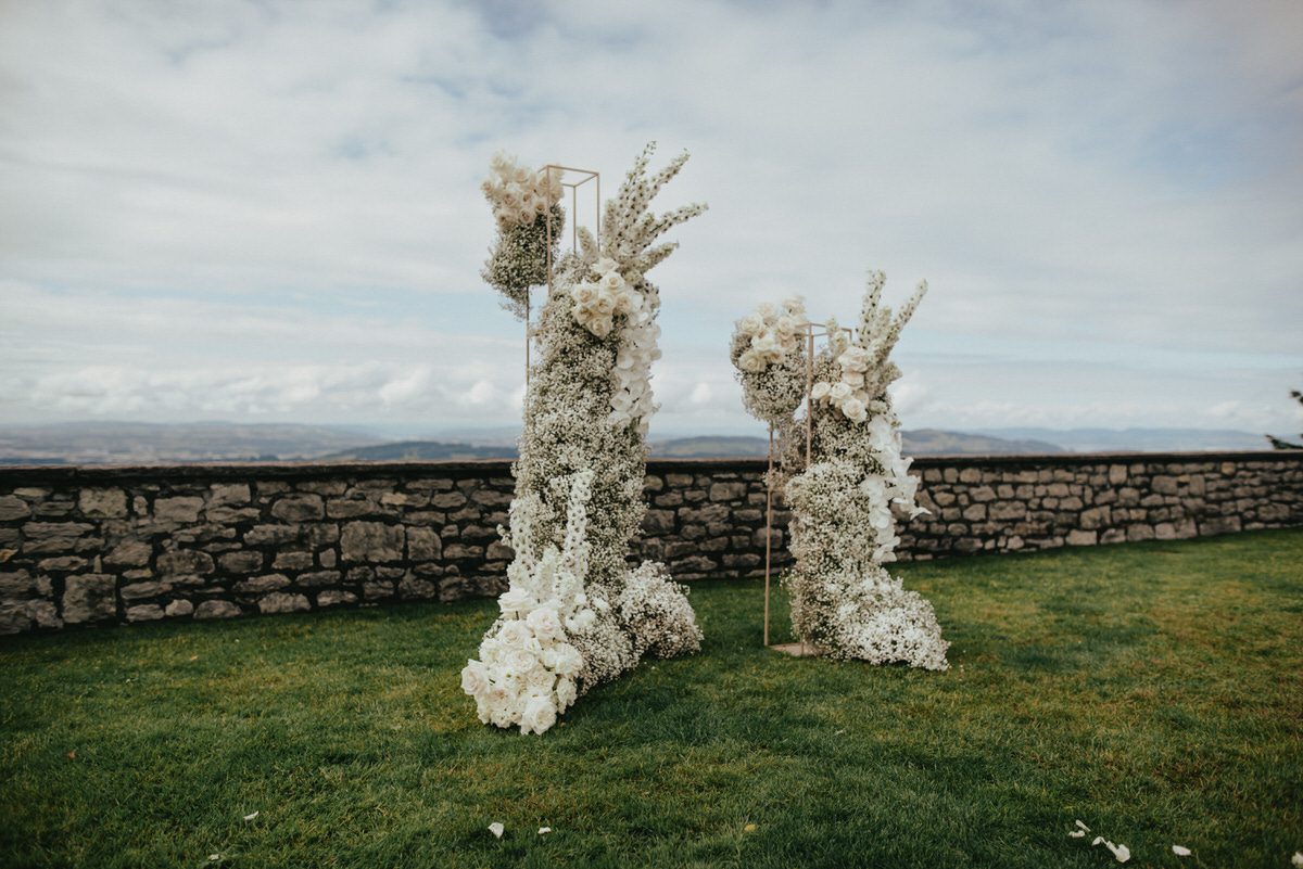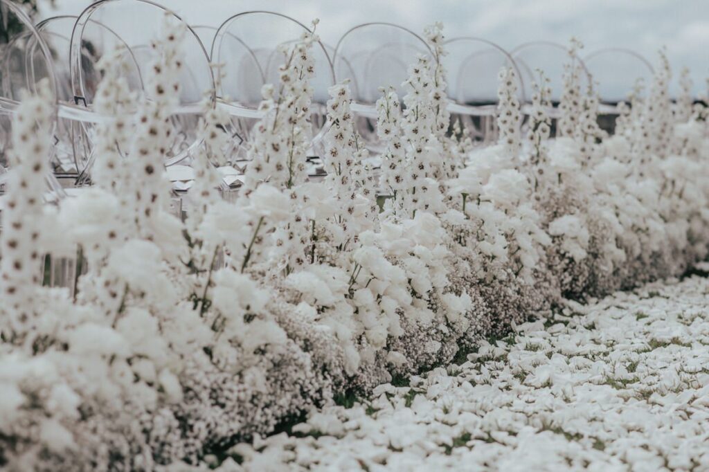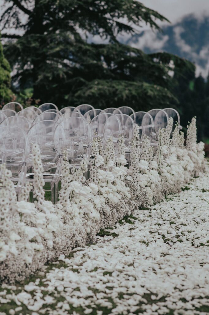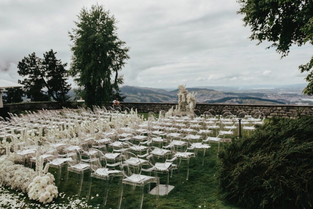 In einem weißen Blütenmeer konnten die Frischvermählten gemeinsam durch den Traugang schreiten. MyAwina hat sich bei der Hochzeitsfloristik mit einem speziellen „Traubogen” und eleganten Blumenarrangements entlang des Hochzeitsganges selbst übertroffen. Die Blumen und unsere schicken Ghost Chairs setzten den Spa-Garten im wunderschönen Bürgenstock Resort perfekt in Szene.