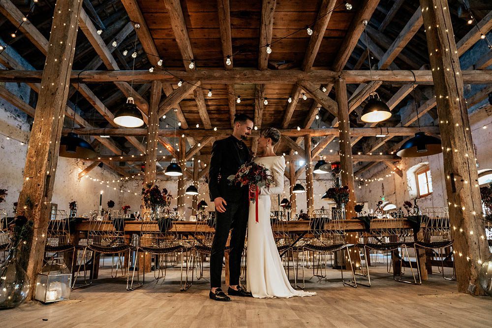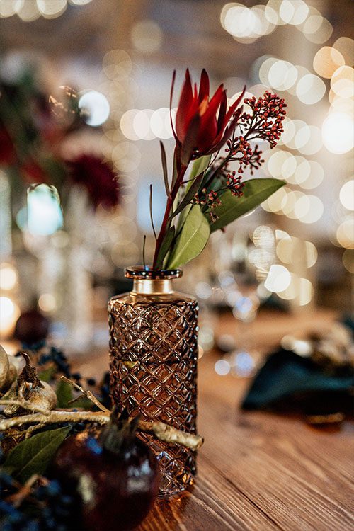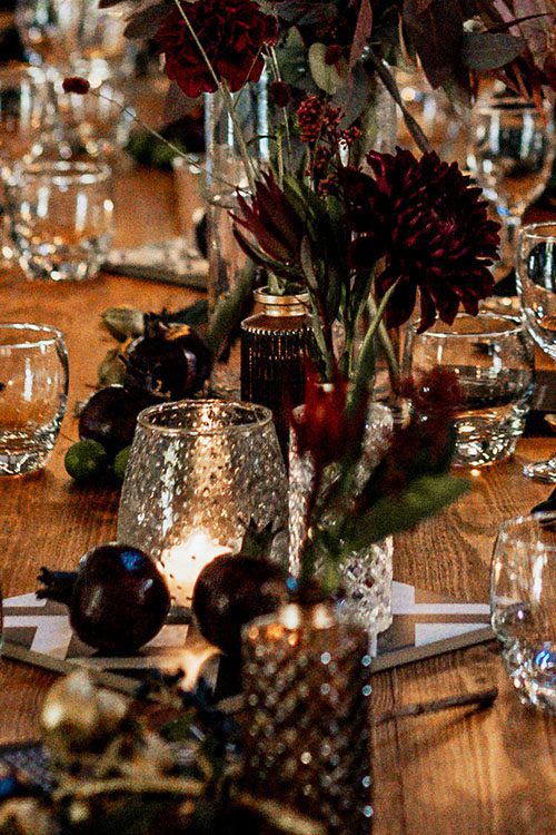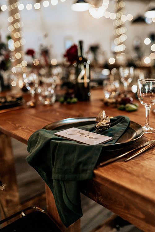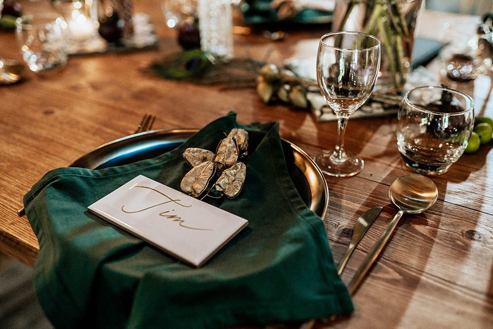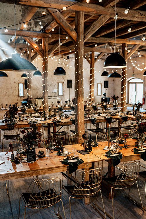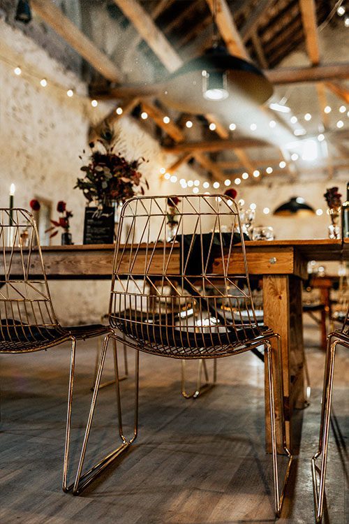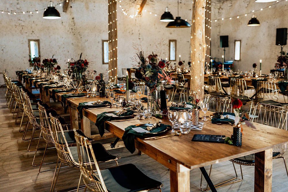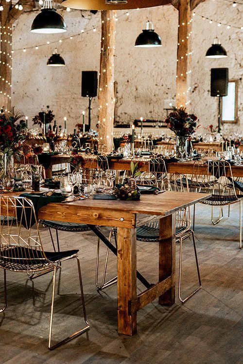 Unsere Lucy Wire Chairs in gold passen perfekt zu den rustikalen Holztischen und verleihen der Scheune auf den ersten Blick einen extravaganten Look. Auf den Holztischen zum mieten bildete das Table Top ein Ensemble aus Dahlien und Pfauenfedern – alles vor allem bordeauxrot. Schöne Blumen in außergewöhnlichen Vasen in verschiedenen Farben, das Goldbesteck, besondere Teller und unsere samtweichen Velourservietten in grün: unglaublich schön!