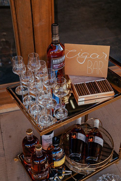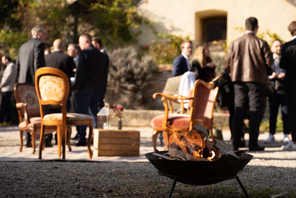 Auch den Außenbereich schmückten zahlreiche Sessel, Teppiche und Lounges. Feuerschalen sorgten für das gemütliche Ambiente, denn es war im Herbst natürlich schon recht kühl. Das Feuer knistert, auf dem goldenen Spiegelwagen stehen Zigarren und Schnaps bereit. So hält man sich warm, bis es rein in die Scheune geht.