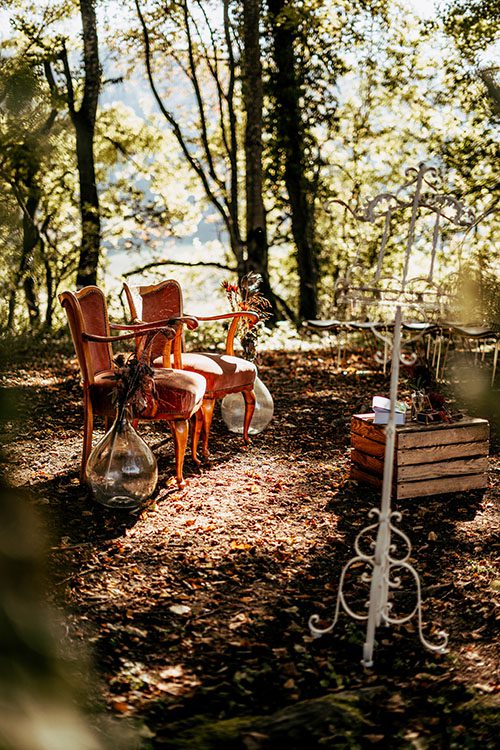 Die freie Trauung fand auf einer Lichtung im Wald statt. Hier musste logistisch alles koordiniert und ausgeführt werden. Im ruhigen Wald, Natur pur, grüne Bäume und Herbstlaub und dazu unsere goldenen Lucy Wire Chairs: We love it! Einfach etwas ganz besonderes. Nach der Trauung transportierten wir für unsere Kunden die Lucy Wire Stühle von der Traulocation hinab zur Scheune, in der das Dinner und die abendliche Feier stattfinden sollten.
